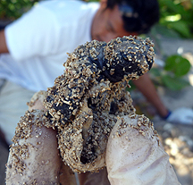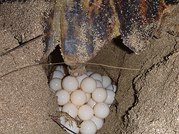 Lidia Salinas (L), Quinto (C) and Henrique (R) burry a nest of eggs that was purchased before the "Veda" began.
