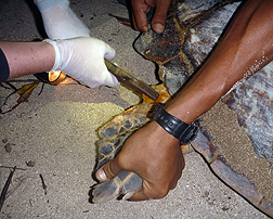 After he found a satellite tag, Christian (R), a fisherman, gave it to Reina (C), his grandmother. The satellite tag is being returned to Steve Dunbar (L).