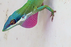 Anolis allisoni, commonly known as the blue-headed anole, displaying its beautiful pink dewlap. |