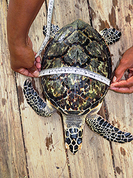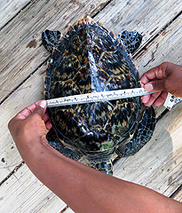 Graduate student, Marsha Wright, collects morphological measurements of a hawksbill turtle. |