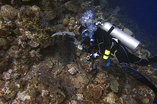 Dr. Dunbar prepares to hand-capture a resting green turtle. |