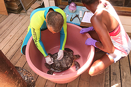Dr. Dunbar and his graduate student, Marsha Wright, collect morphometrics and biological samples from a juvenile hawksbill. |