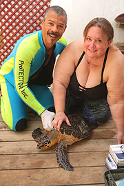 Anna Rumbelow (a Dive Master at our New Partner dive shop, Splash Inn) and Stephen Dunbar pose with a hawksbill sea turtle. |