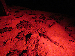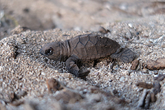 Newly hatched baby hawksbills emerge from the nest and make their way to the water. |
